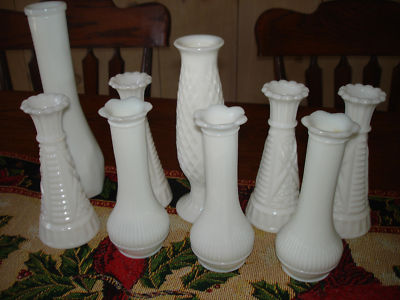 Title (ebay affiliate link): Vintage Lot 9 Milk Glass Bud Vases- 6"-8"- Wedding, Cottage style- great variety