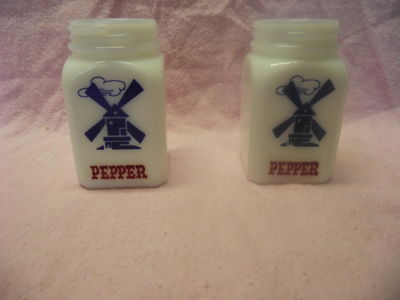 TWO HAZEL ATLAS PEPPER SHAKERS MILKGLASS with BLUE WINDMILL