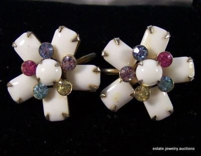 Title (ebay affiliate link): Vintage Earrings Signed WEISS White Milk Glass Pink Rhinestone Screwback OLD