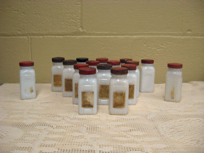 VINTAGE SET OF 16 RED & BLACK CAP MILK GLASS GRIFFITH LABORATORIES SPICE SET