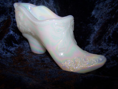 Title (ebay affiliate link): LOVELY MOSSER ART GLASS MILK GLASS CARNIVAL BOW SLIPPER SHOE