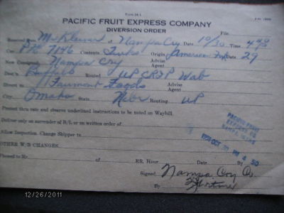 Title (ebay affiliate link): PACIFIC FRUIT EXPRESS CO 1954 RAILROAD DIVERSION ORDER NAMPA IDAHO