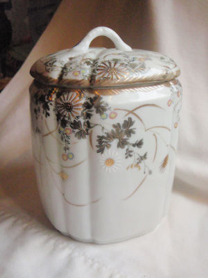 Title (ebay affiliate link): ANTIQUE PORCELAIN RIBBED BISCUIT JAR HAND PAINTED BROWN GOLD ACCENT FLOWERS