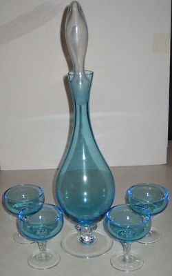 Antique WINE DECANTER w stopper & 4 wine glasses BLUE glass