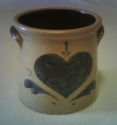 1991 Strawtown beige and blue heart pottery crock (Indiana)