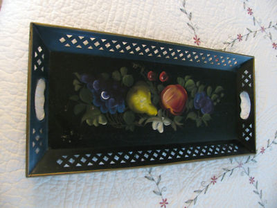 Title (ebay affiliate link): vintage toleware pierced rectangular black tole tray with fruit, flowers Anatole