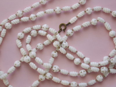 Title (ebay affiliate link): VINTAGE ART DECO FLAPPER LENGTH MOLDED MILK GLASS BEADED NECKLACE