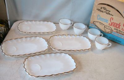 Title (ebay affiliate link): NEW OLD STOCK NOS ANCHOR HOCKING MILKGLASS 22K GOLD TRIM 8 PC SNACK SET