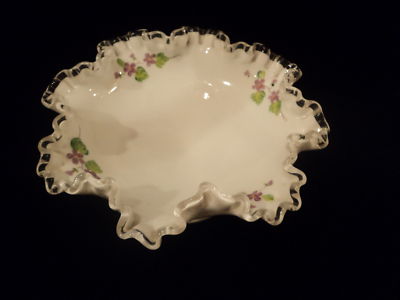 FENTON SILVER CREST VIOLET MILK GLASS HANDPAINTED RUFFLED FOOTED DISH