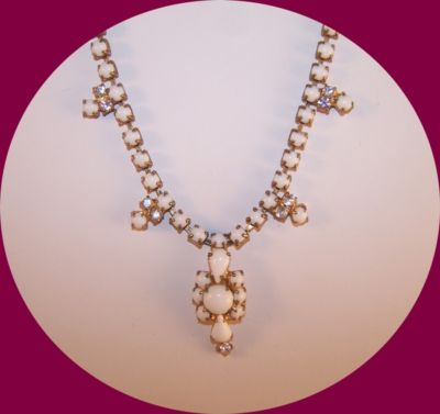 Title (ebay affiliate link): VINTAGE WHITE MILK GLASS BEAD NECKLACE WITH SPARKLING CLEAR RHINESTONES.