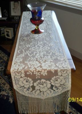 Title (ebay affiliate link): FRENCH LACE FRINGE SCARF-FURNITURE-DRESSER-TABLE RUNNER-SHAWL WRAP-ANTIQUE ROSE