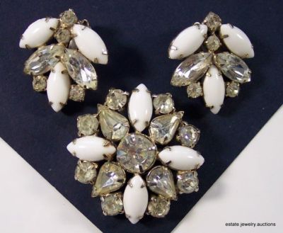 Title (ebay affiliate link): Vintage SET Brooch Pin Earrings White Milk Glass Clear Rhinestone Silver tone Je