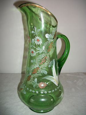 Beautiful Green Depression glass Pitcher, "Hand Painted"