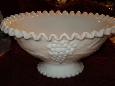 Title (ebay affiliate link): INDIANA - WHITE MILK GLASS Beaded Edge COMPOTE Bowl - Grapes and Leaves