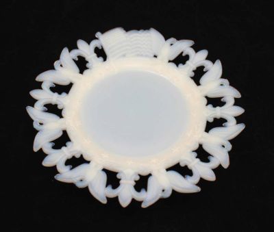 Title (ebay affiliate link): Milk Glass Plate Laced Edge American Theme Flag Eagle Luncheon Size
