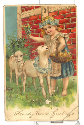 100+ YR OLD EASTER POSTCARD PRINTED IN GERMANY YOUNG GIRL LAMBS CHICKS IN BASKET