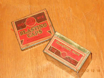 vtg-ATLAS powder co.~BLASTING CAPS tin~Orange,Brown and Beige on BRASS TIN
