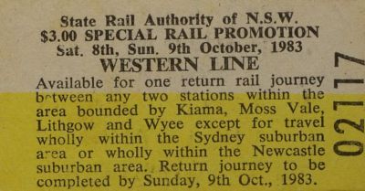 Railway ticket NSW SRA Western line promotion $3.00 October 1983