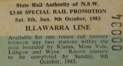 Railway ticket NSW SRA Illawarra line promotion $3.00 October 1983