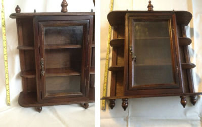 Title (ebay affiliate link): Antique wooden wall cabinet with three shelves, glass door with handle.