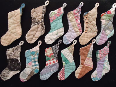 Title (ebay affiliate link): 12 PRIMITIVE ANTIQUE CUTTER QUILT CHRISTMAS SANTA STOCKINGS