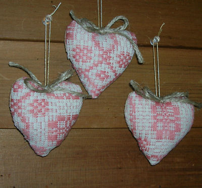 Title (ebay affiliate link): Primitive VALENTINE Vintage Woven Pink Coverlet Tucks Mini Hearts Set 3 Ornies