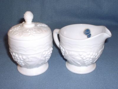 Title (ebay affiliate link): Imperial Glass Covered Sugar Bowl & Creamer Vintage Grape Milk White