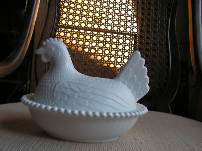 WHITE MILK GLASS COVERED CHICKEN CANDY/ NUT BOWL/DISH