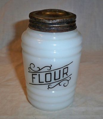 Title (ebay affiliate link): VINTAGE WHITE MILK GLASS FLOUR RANGE SHAKER DREDGER DREDGE W/ LID HAZEL ATLAS?