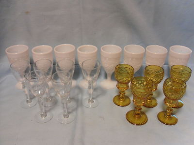 Title (ebay affiliate link): 19 VINTAGE STEMWARE CORDIAL GLASSES / 8 MILK GLASS, 6 WHEAT PATTERN , 5 AMBER