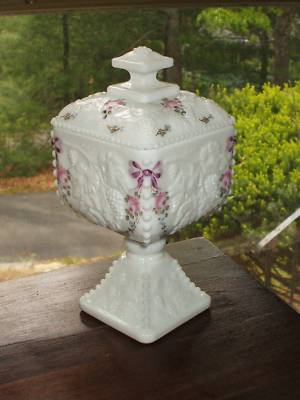WESTMORELAND ROSES BOWS BEADED MILK GLASS WEDDING BOWL