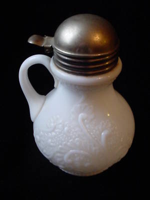 ANTIQUE FLOWERED MOLDED MILK GLASS SYRUP PITCHER
