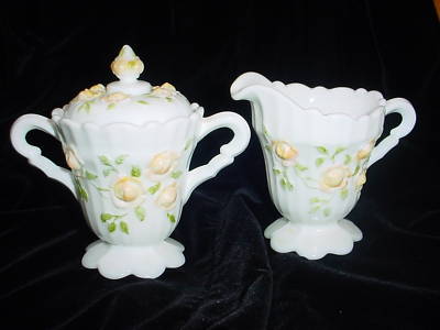 ANTIQUE YELLOW ROSES MILK GLASS SUGAR & CREAMER
