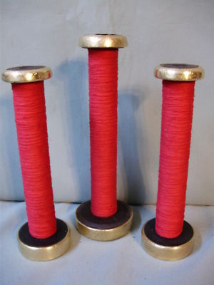 Title (ebay affiliate link): 3 VINTAGE MILL SPOOLS BOBBINS WITH BRASS RED YARN 7 1/2-8 1/2 INCHES TALL