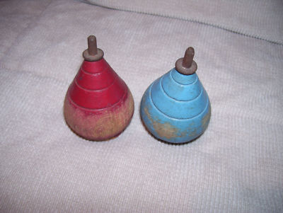 Title (ebay affiliate link): 2 VINTAGE WOODEN TOY TOPS, OLD BLUE AND RED WORN PAINT, WELL LOVED CHILD'S TOYS!
