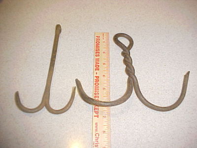 Title (ebay affiliate link): 2 VINTAGE HAND FORGED TRAP DRAGS MEAT HOOKS TWISTED METAL GRAPPLES NEWHOUSE