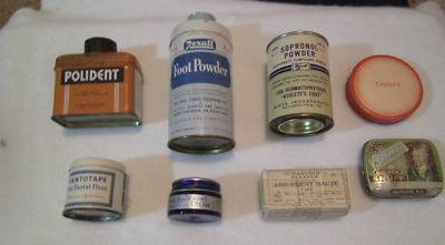 (LOT OF 8) VINTAGE MISC MEDICINE, SNUFF, POWDERS, FLOSS, TINS,CANS