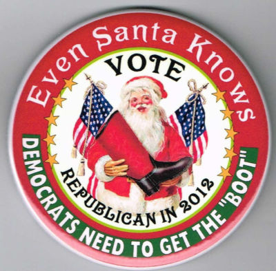 Title (ebay affiliate link): 3" EVEN SANTA CLAUS KNOWS, VOTE REPUBLICAN GUARDFROG PIN, PINBACK BUTTON #711
