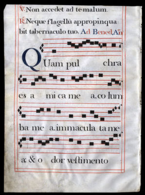 Title (ebay affiliate link): 1650 Large Spanish Breviary Leaf Vellum Latin Music Antiphoner Choir Monks