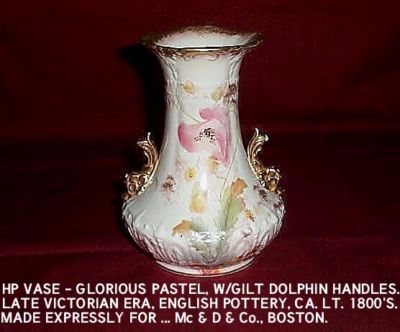 Title (ebay affiliate link): STAFFORDSHIRE POTTERY VASE: HP FLORALS. 6.5" T. DOLPHIN HANDLES. CA. LT.1800'S