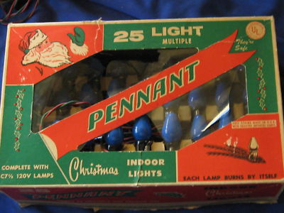 Title (ebay affiliate link): VINTAGE CHRISTMAS LIGHTS 25 PENNANT C7 GE BLUE BULBS IOB ALL WORKING
