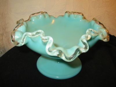 VINTAGE TURQUOISE MILK GLASS SILVER CREST FOOTED COMPOTE
