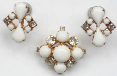Beautiful vintage 1950s milk glass & rhinestone brooch and earrings - Austria