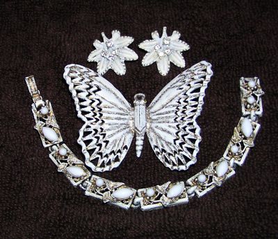 VINTAGE 5 PC LOT ENAMEL MILK GLASS & RHINESTONES PINS PENDANT BRACELET EARRINGS
