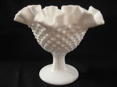 Title (ebay affiliate link): Vintage FENTON White Milk Glass Hobnail Pedestal 6 inch Vase Ruffle Edge