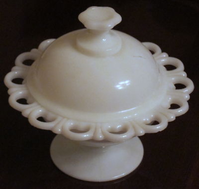 Title (ebay affiliate link): VINTAGE MILK GLASS CANDY DISH CATCH-ALL COMPOTE TRINKET PEDESTAL BOWL PEDESTAL