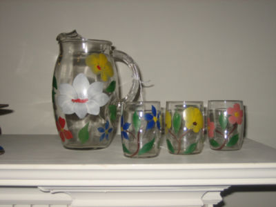 VINTAGE SHABBY PITCHER/JUICE GLASS SET