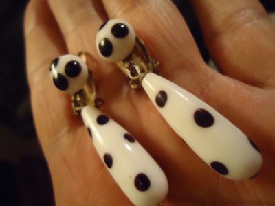 Title (ebay affiliate link): VINTAGE BLACK POLKA DOTS WHITE MILKGLASS DANGLE STYLE DECO STYLE EARRINGS-JAPAN