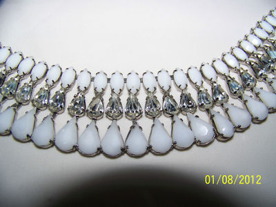 Title (ebay affiliate link): VINTAGE 1940s~50s WHITE MILK GLASS CLEAR RHINESTONES BIB NECKLACE closed back