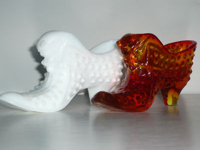 Vintage FENTON USA ART GLASS Hobnail Cat Head Shoes Milk Glass & Amberina *2
